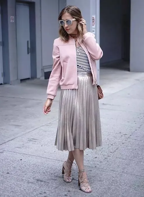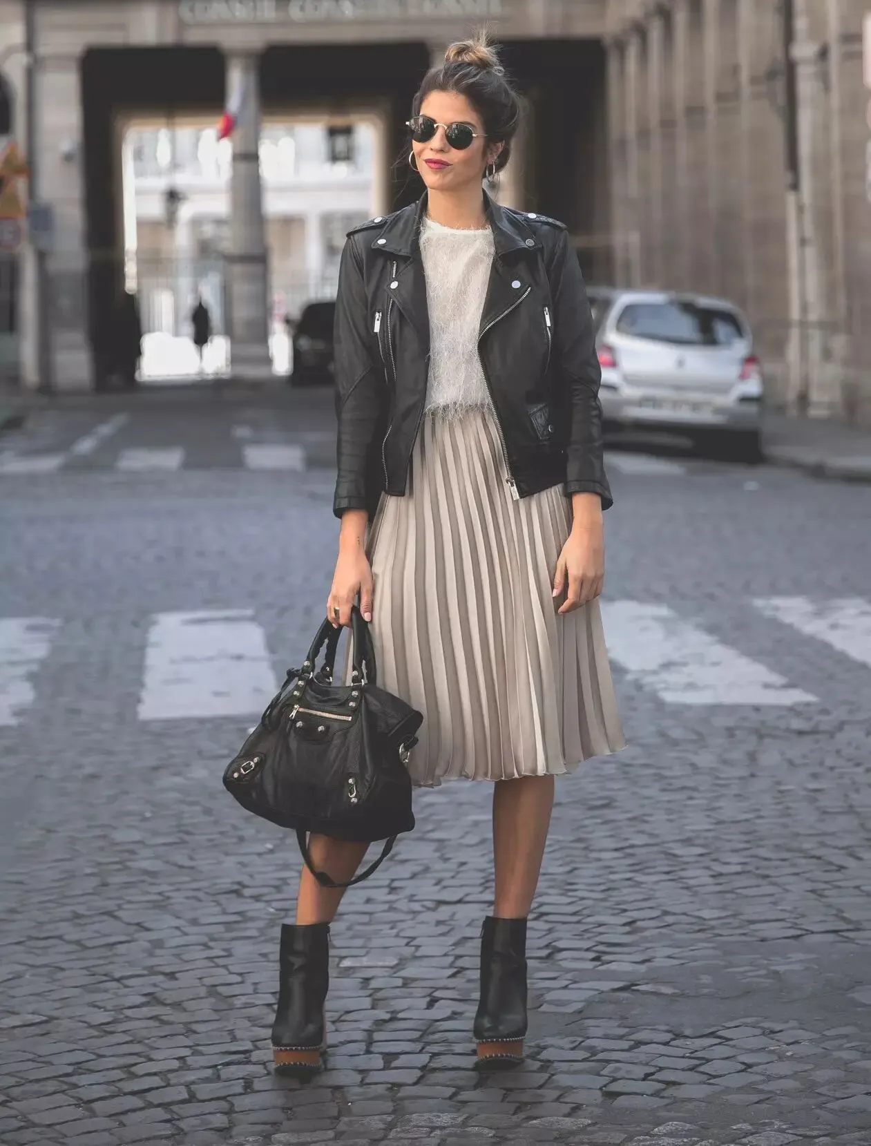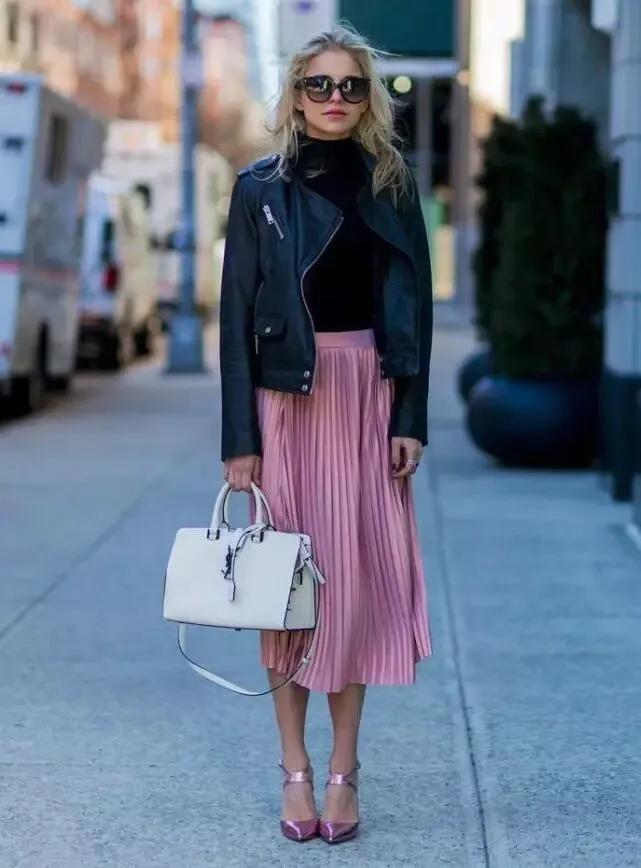 粉嫩的金属色百褶裙搭配帅气机车夹克,
