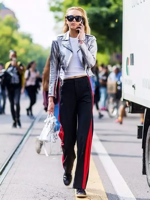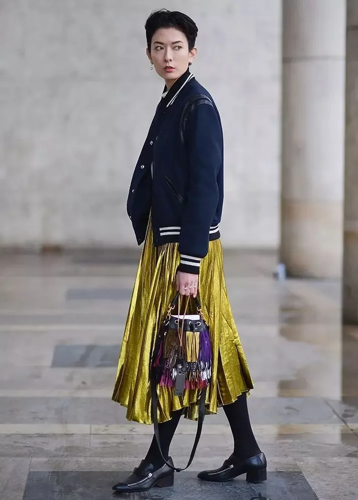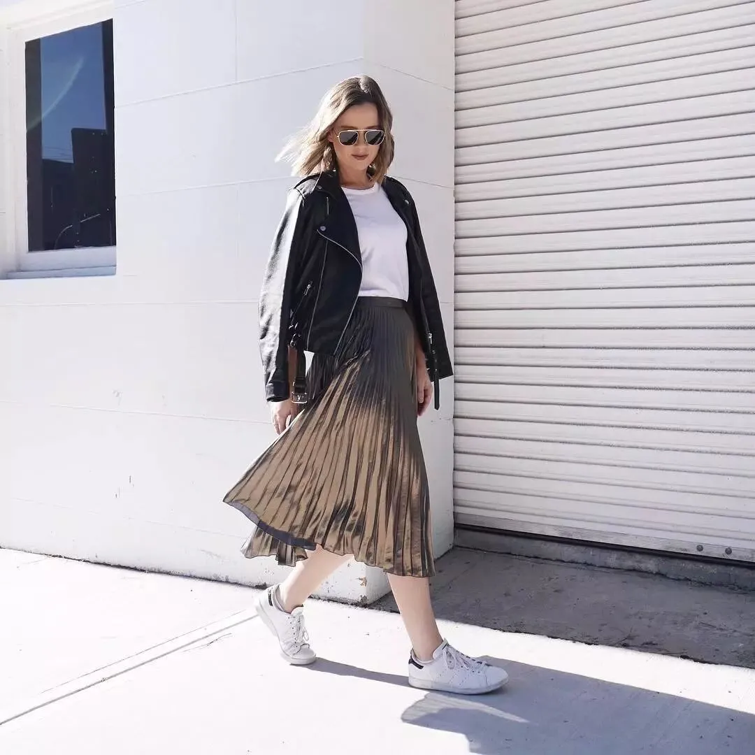 当粗旷的机车夹克配上金光闪闪的百褶裙,