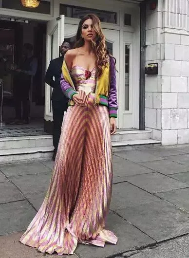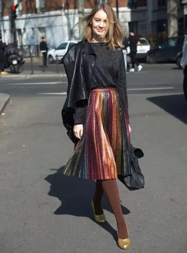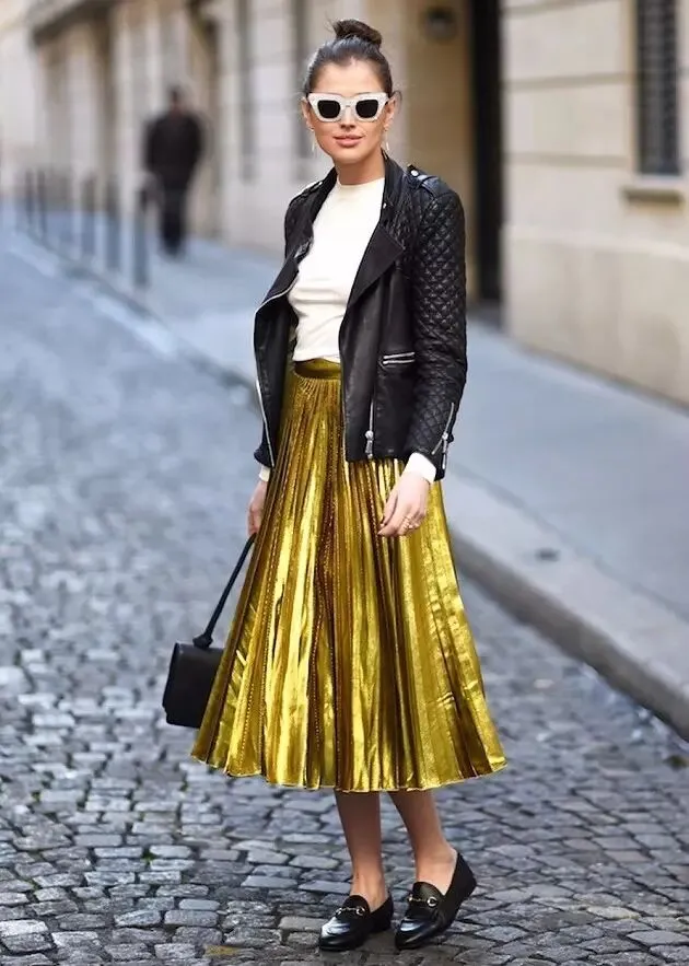 色彩丰富的金属色百褶裙搭配机车夹克,