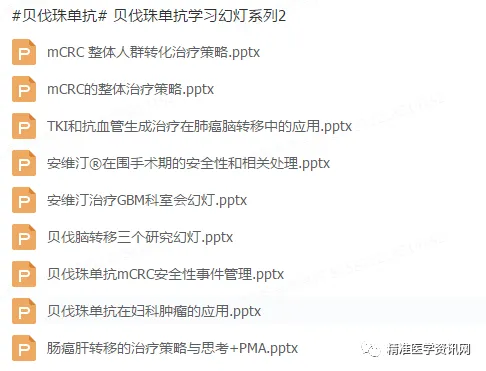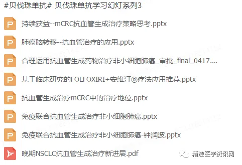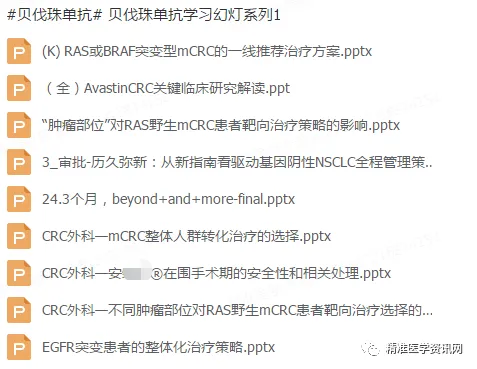 本次上传的资料是:20多份贝伐珠单抗在肠癌、肺癌、脑胶质瘤等方面的幻灯片(PPT),部分截图如下,加入知识星球即可获取。目前已上传的其他肿瘤治疗相关幻灯如下。