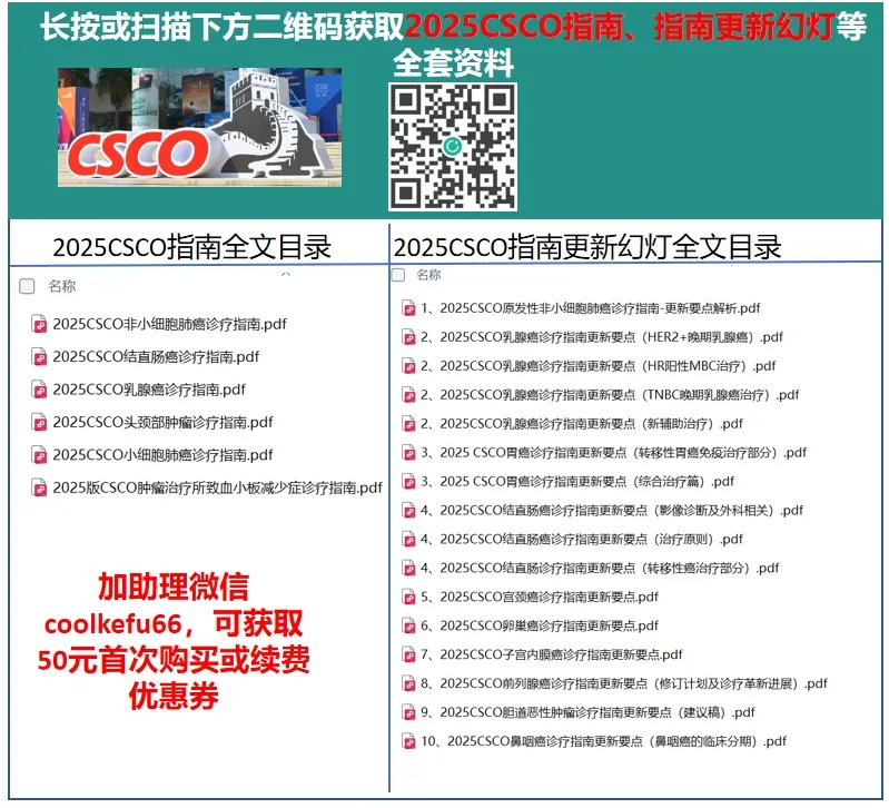 【历年CSCO指南及更新幻灯;肺癌、乳腺癌、肠癌等PPT;WCLC、ESMO、ASCO会议幻灯;免疫治疗幻灯;肿瘤基因检测等】获取方法:点击下方卡片,前往【指南幻灯资料库】,对话框回复【CSCO】,获取8000份资料