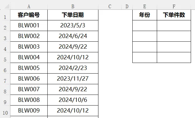 我们有一张包含1500条客户订单记录的Excel表格,包含“客户编号”和“下单日期”两列关键信息。目标是:按年份统计每年的“下单件数”。