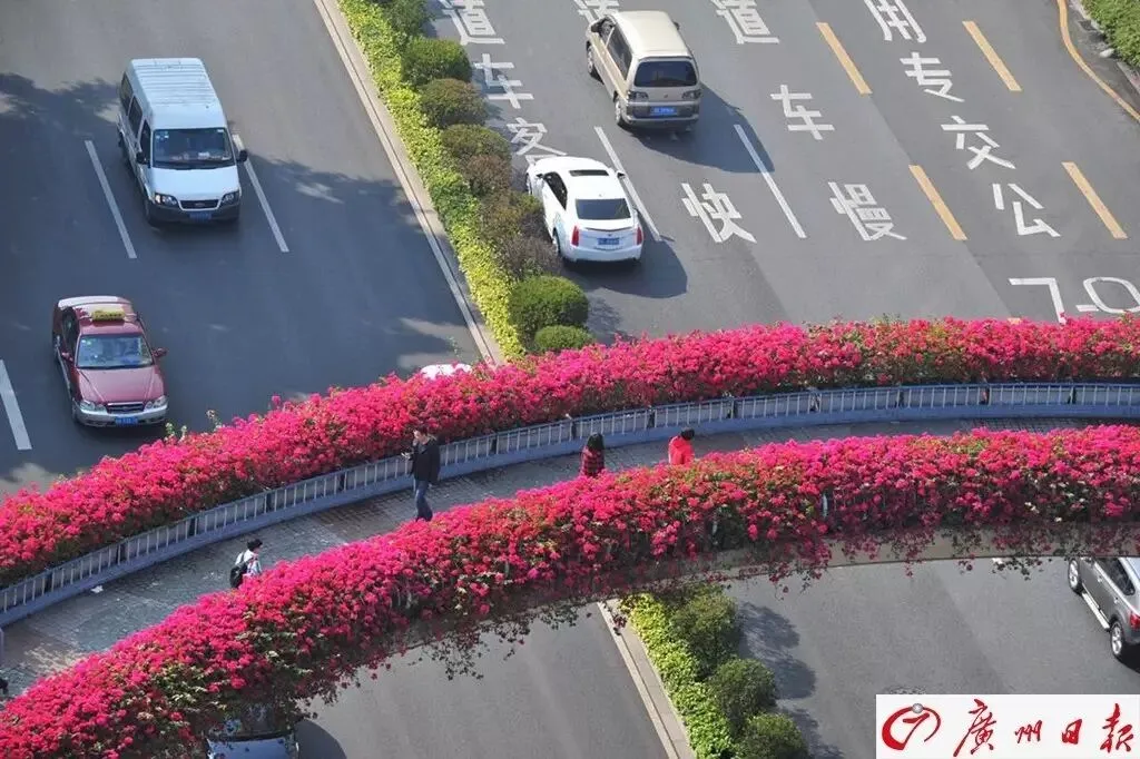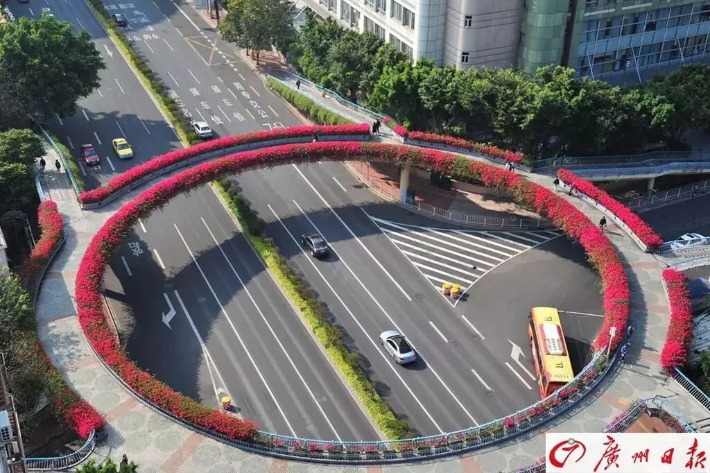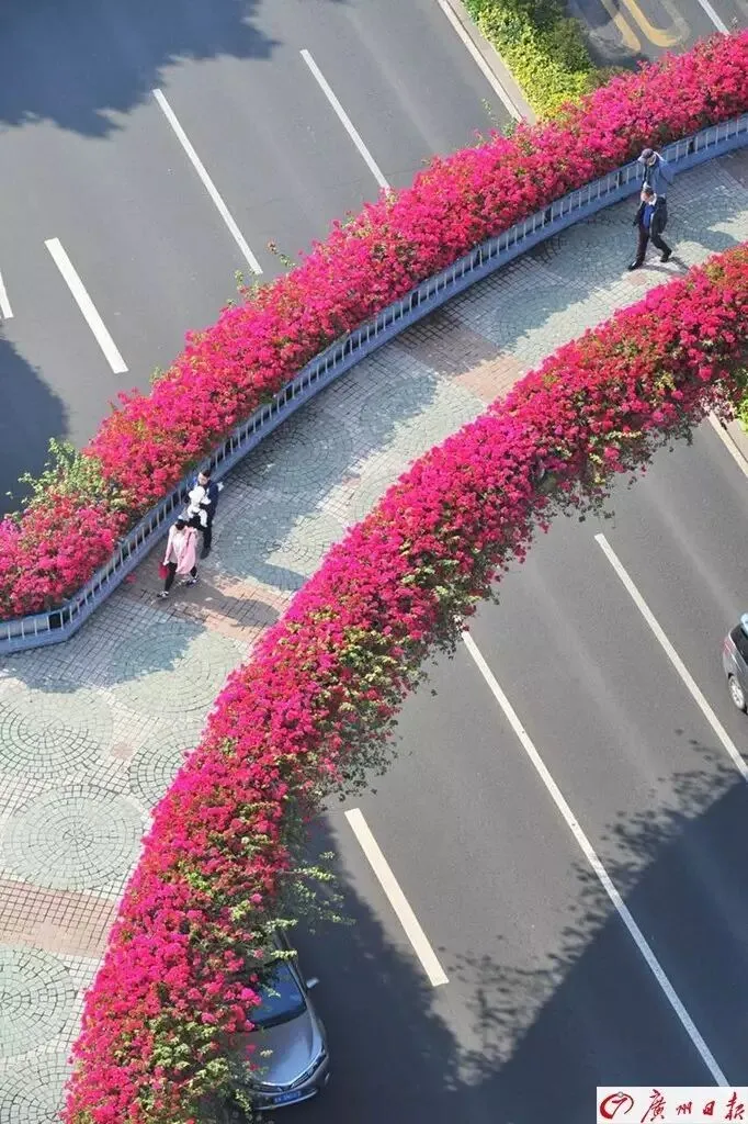 ▲2017年2月12日,广州市东风路一座圆形天桥上,红色的簕杜鹃已然盛放。