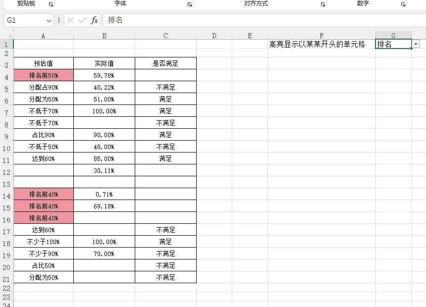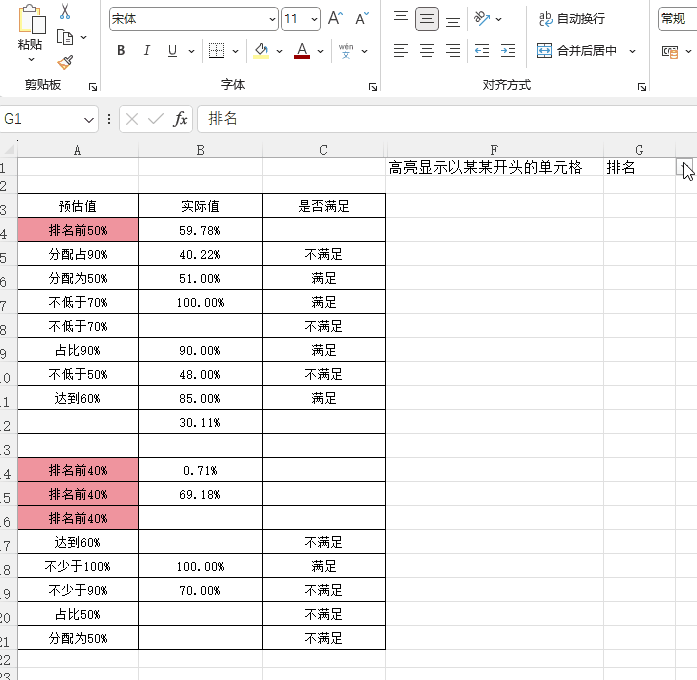 所有以“排名”开头的单元格都会自动高亮: