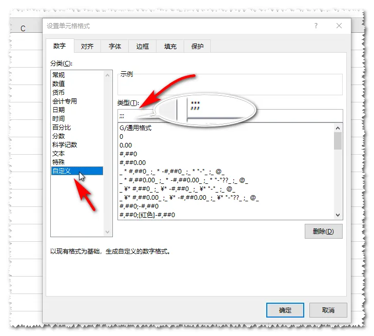 选择“自定义”在“类型”下输入英文的三个分号。然后点“确定”。
