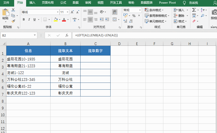 说明:先用SEARCHB("?",A2)查找出第一个数字在字符串中的位置;2*LEN(A2)-LENB(A2)则是计算出数字的个数;最后用MIDB函数提取出来。这里带有B后缀的函数公式,都是按照字节数进行计算。