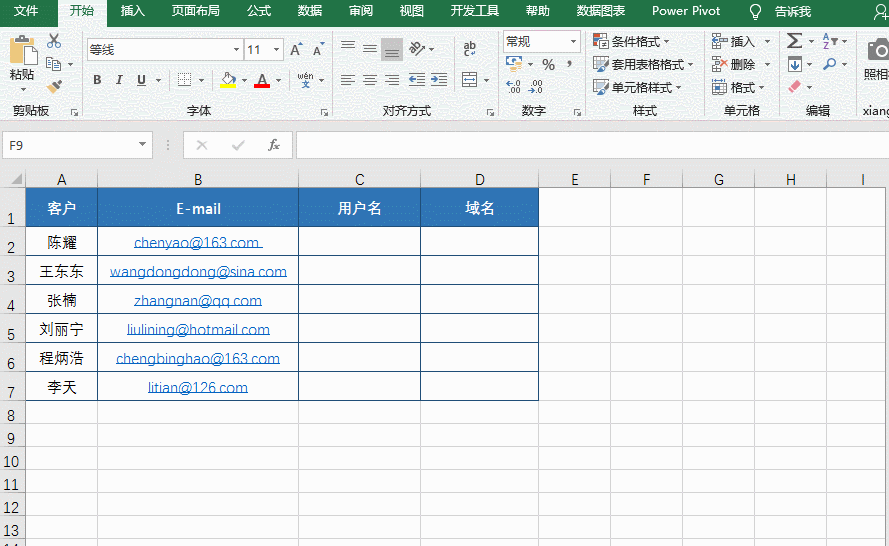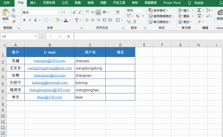 如图中表格所示,我们需要从邮箱地址中提取出用户名和域名。
