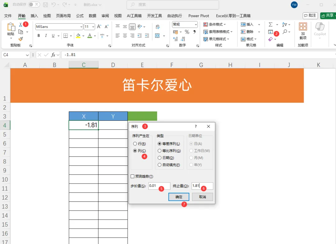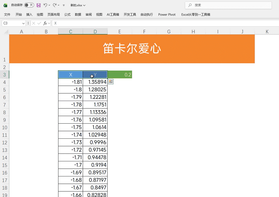 我们需要通过散点图来设置这个爱心,就需要来创建X轴跟Y轴,首先构建X轴