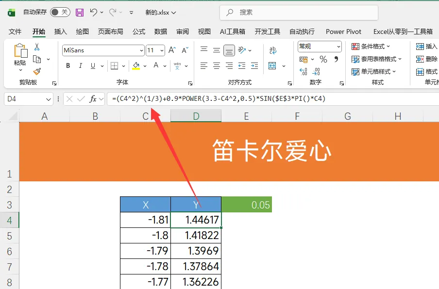 公式:=(C4^2)^(1/3)+0.9*POWER(3.3-C4^2,0.5)*SIN($E$3*PI()*C4)