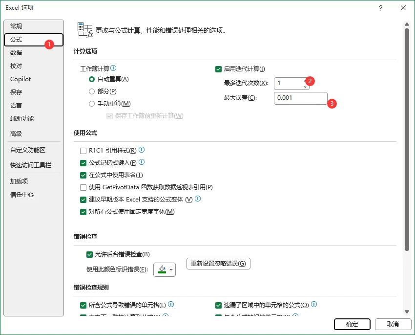 我们需要在右上角点击【文件】然后在最下方调出【选项】显示Excel选项,紧接着找到【公式】勾选【启动迭代计算】把最大迭代次数设置为1,然后点击确定