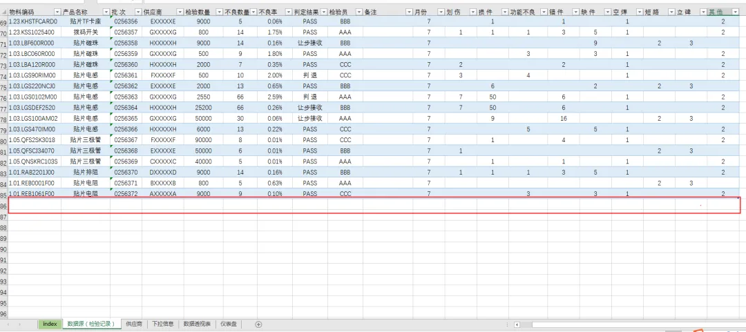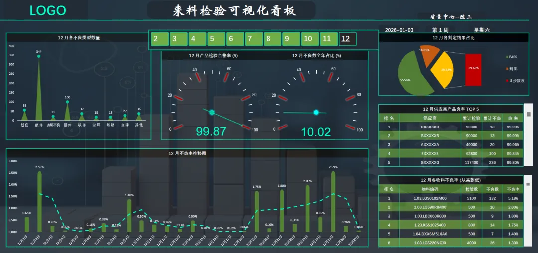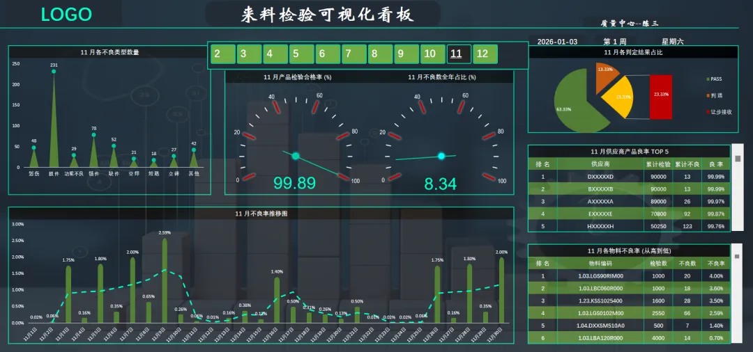 来料检验可视化看板:来料检验可视化看板是一种基于Excel等工具构建的动态数据看板,它能够将复杂的来料检验数据转化为直观的图表和仪表盘。该看板核心功能包括支持按月切换查看检验数据、统计各供应商的不良率排名、分析不同物料的不良类型,并以柱状图、饼图等形式展示合格率推移和结果分布。它有效提升了质量管理人员对供应链质量的监控效率,为决策提供了实时、准确的数据支持。本期分享的来料检验可视化看板2.0与之前发布的只此青绿版本有所不同,本次分享的作品主要为零代码,完全由函数公式加数据透视表实现。即使没有VBA基础也能快速编辑和使用。