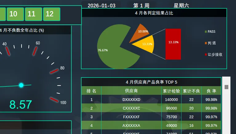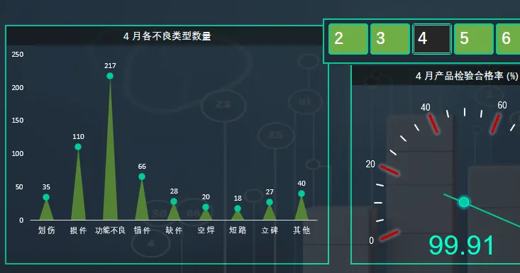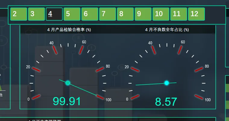 2.2 合格率与不良数占比:图表中上方以仪表盘的方式统计选择月份当月的检验合格率以及当月累计不良数量在全年不良数的占比。点击月份按钮后,仪表盘指针随之切换。