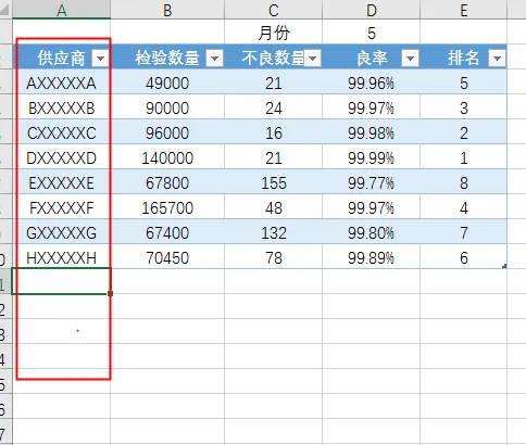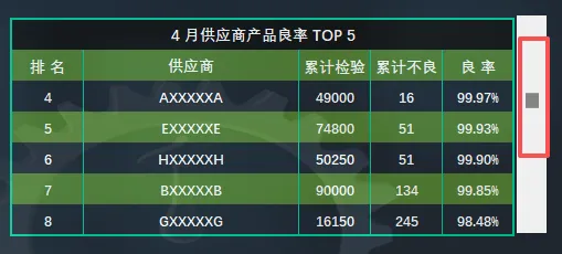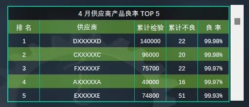 2.4供应商来料良率:图表右边中间位置以列表的方式统计选择月份供应商来料良率的排名(统计排名为TOP 5)可通过右方滚动条滚动查看更多排名的数据。