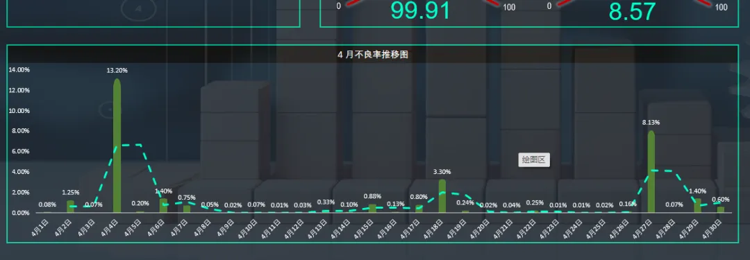 2.5不良率推移图:图表左下方以柱形图的方式统计选择月份每日的不良率,并自动生成不良率推移图。(月份切换后图表自动切换)