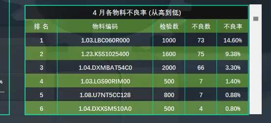 2.6物料不良率:图表右下方以列表的方式统计当月各物料的不良率,不良率从高到低显示,可通过滚动条下拉显示。(月份切换后图表自动切换)