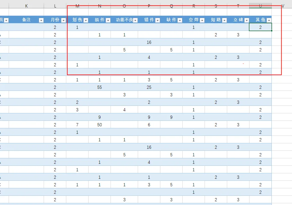 6.1 首先要在数据源(检验记录的表格中修改),这里可以直接修改不良类型的名字,或通过删除列或插入列的方式删除或增加不良类型。