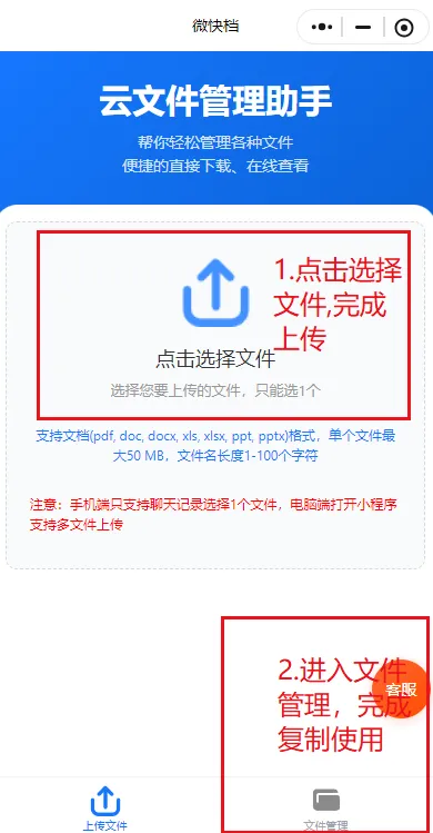 进入小程序后,在功能菜单中找到【上传文件】选项,点击进入上传页面;接着选择你需要插入公众号的文档(支持 Word、Excel、PDF 格式),选中后点击确认,等待文件上传完成即可。