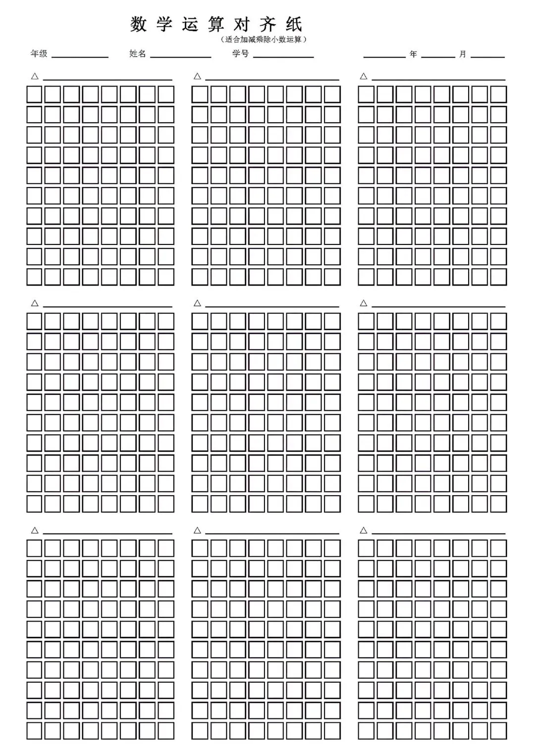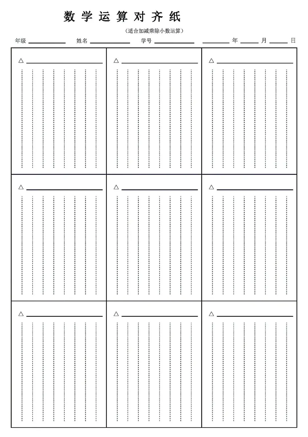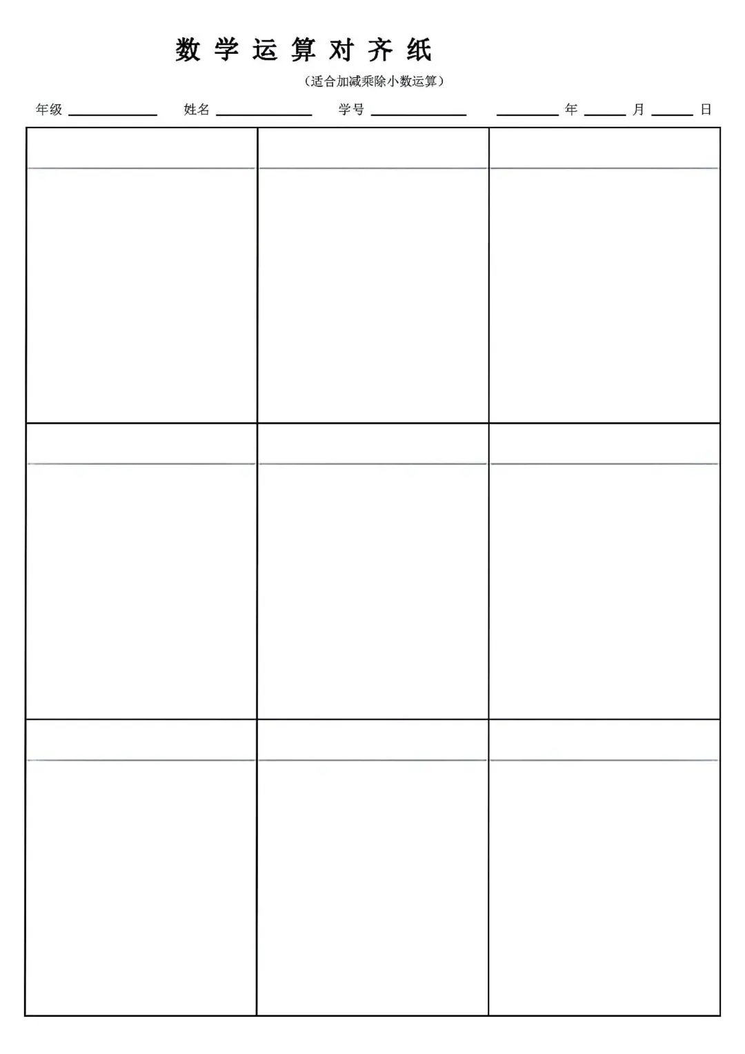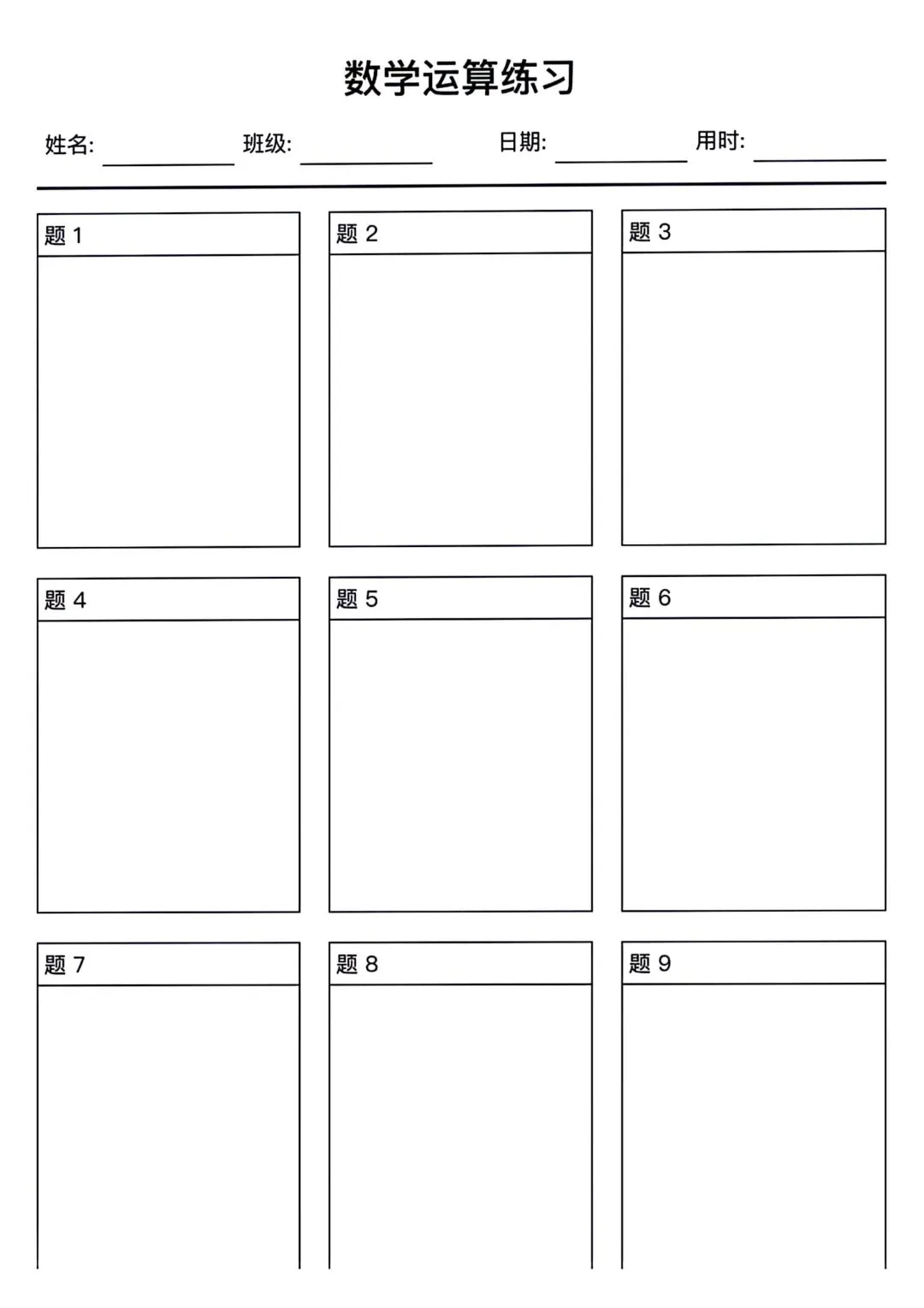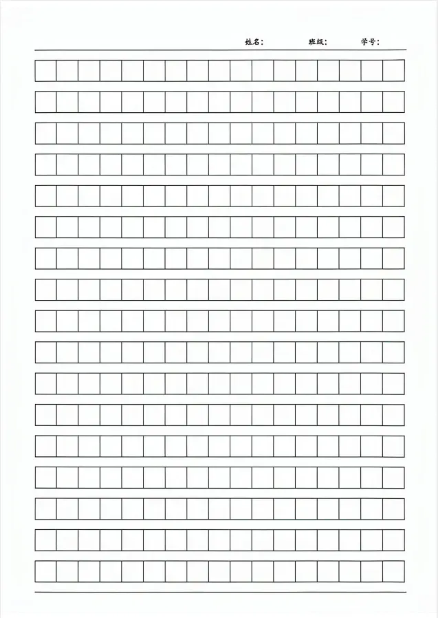 教育部出台的多个文件,像语文课程标准、书法教育指导纲要等,都明确了不同阶段学生要练书写,现在小学里写字课已经成了重要内容。写字不光对语文学习很关键,其他学科也都离不开。字写得好、排版整齐,一辈子都能受益。对小学生来说,练字的过程也是培养行为规范的过程,安排好学习和抄写,两者还能互相促进。小学不管哪门课,书写规范都很重要,和学知识一样关键。比如数学,解题时写得乱,步骤容易出错,思路也会受影响,更别说语文了。尤其是考试时,试卷是扫描进电脑阅卷的,老师没时间慢慢猜模糊的字迹,任务又重,字写得不清楚、不规范,很可能得不到好分数,所以规范书写太重要了。这里给学生准备了各种练习格子,特别是作文格,老师家长可以打印出来给孩子练一练。小学生平时学习常用到各种格子:语文作文的稿纸、写拼音的四线三格、练生字的田字格,数学的运算对齐纸、带线格子,英语的听写纸、单词表、汉英互译单词练习纸、作业纸等专用格子。还有语数英错题本。家长和老师得多留意,随时给孩子提供这些工具。下面是格子的预览图,自己下载就能用。以下是部分模板范本