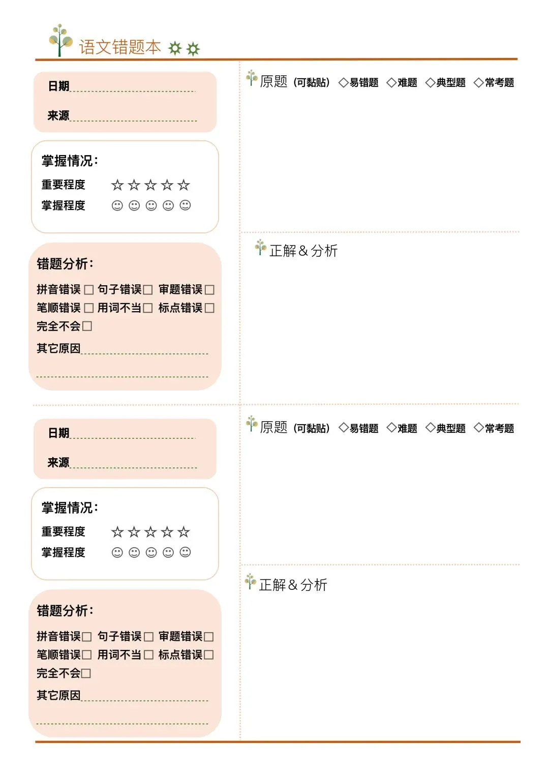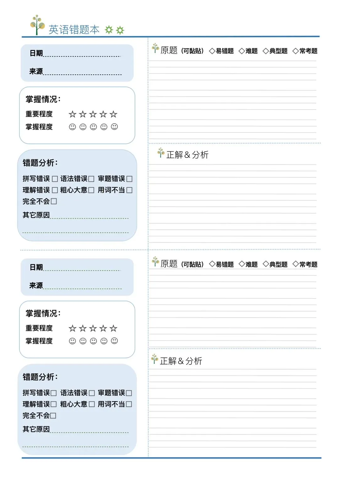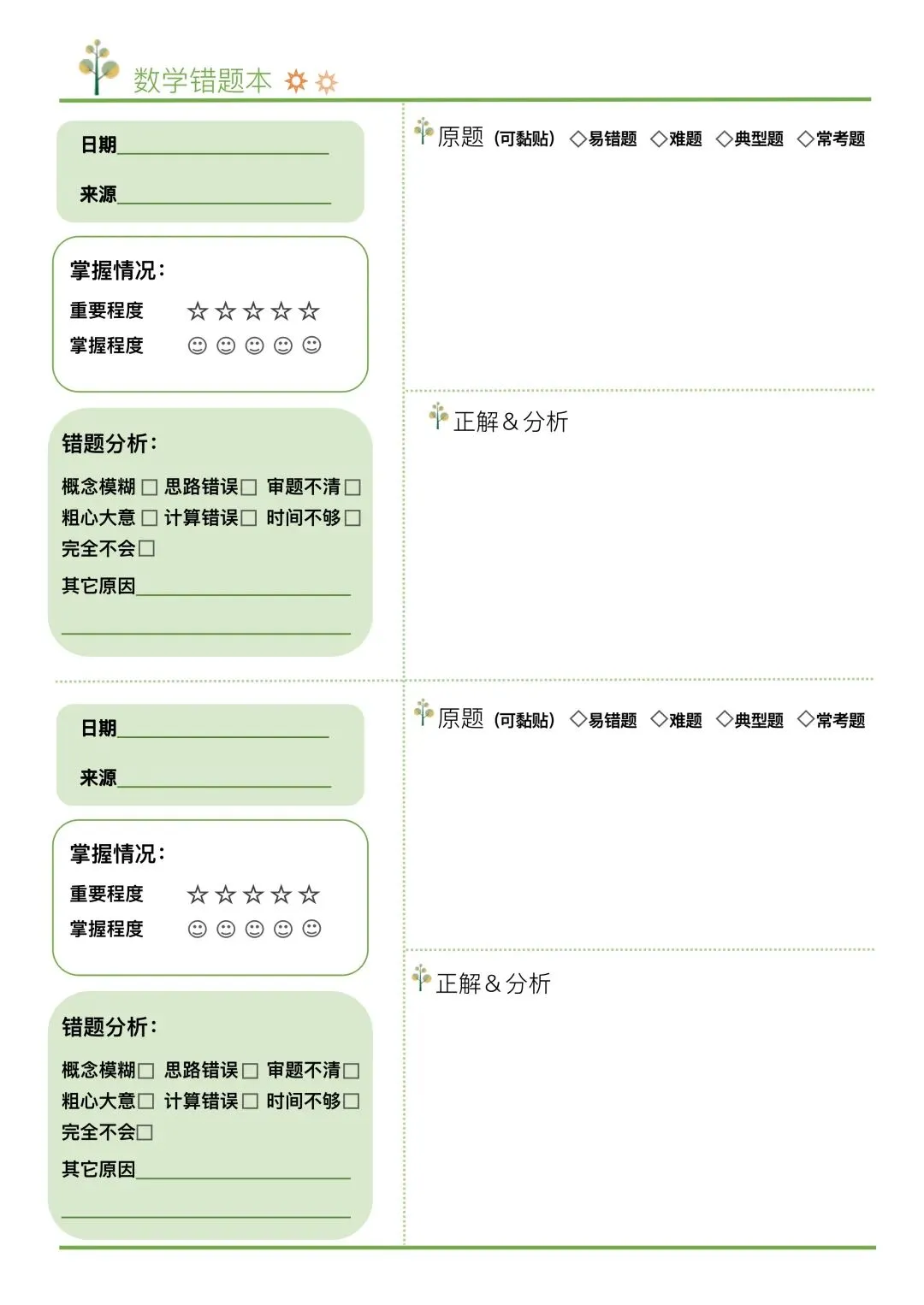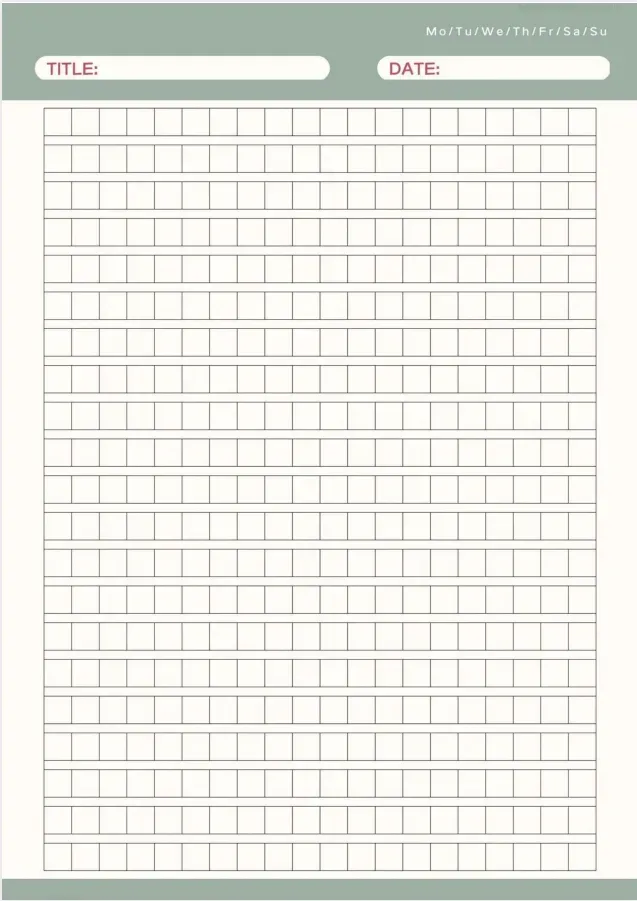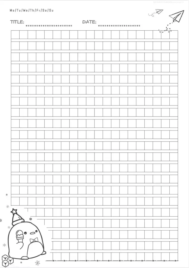 教育部出台的多个文件,像语文课程标准、书法教育指导纲要等,都明确了不同阶段学生要练书写,现在小学里写字课已经成了重要内容。写字不光对语文学习很关键,其他学科也都离不开。字写得好、排版整齐,一辈子都能受益。对小学生来说,练字的过程也是培养行为规范的过程,安排好学习和抄写,两者还能互相促进。小学不管哪门课,书写规范都很重要,和学知识一样关键。比如数学,解题时写得乱,步骤容易出错,思路也会受影响,更别说语文了。尤其是考试时,试卷是扫描进电脑阅卷的,老师没时间慢慢猜模糊的字迹,任务又重,字写得不清楚、不规范,很可能得不到好分数,所以规范书写太重要了。这里给学生准备了各种练习格子,特别是作文格,老师家长可以打印出来给孩子练一练。小学生平时学习常用到各种格子:语文作文的稿纸、写拼音的四线三格、练生字的田字格,数学的运算对齐纸、带线格子,英语的听写纸、单词表、汉英互译单词练习纸、作业纸等专用格子。还有语数英错题本。家长和老师得多留意,随时给孩子提供这些工具。下面是格子的预览图,自己下载就能用。以下是部分模板范本