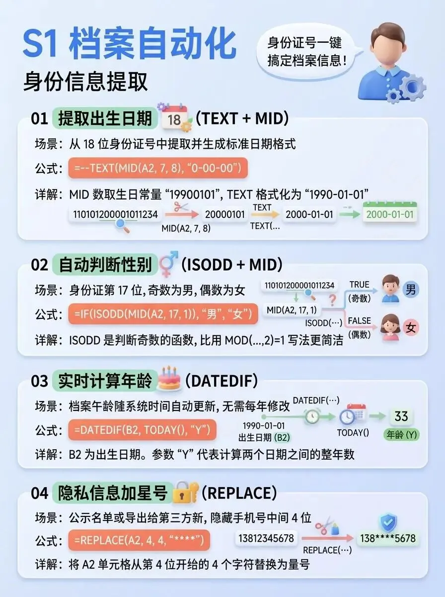 1.档案自动化:提取身份证里的生日、性别、年龄,再也不用一个个手敲,保护隐私还能自动加星号。