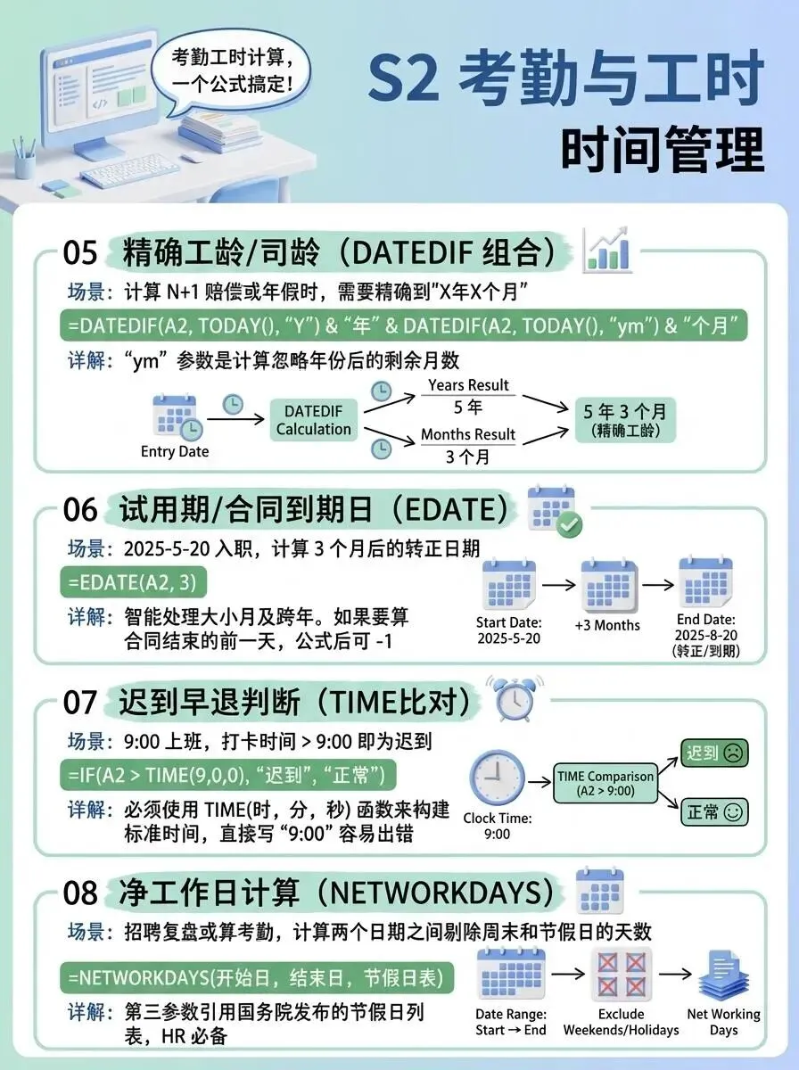 2.考勤工时:精准计算工龄、司龄,处理迟到早退数据,NETWORKDAYS算净工作日超好用!