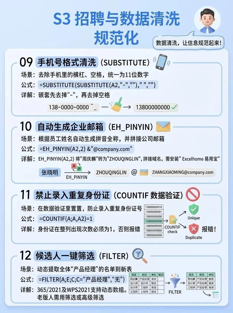 3.招聘清洗:手机号格式一键统一,自动生成企业邮箱,重复录入身份证立马报警。