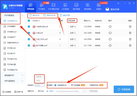 接着选择转换页码、在下方设置转换格式、转换模式,点击【开始转换】,等待进度条完成即可。
