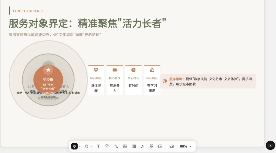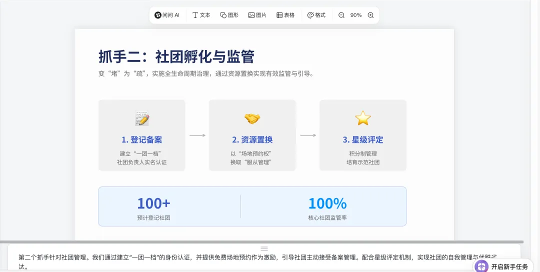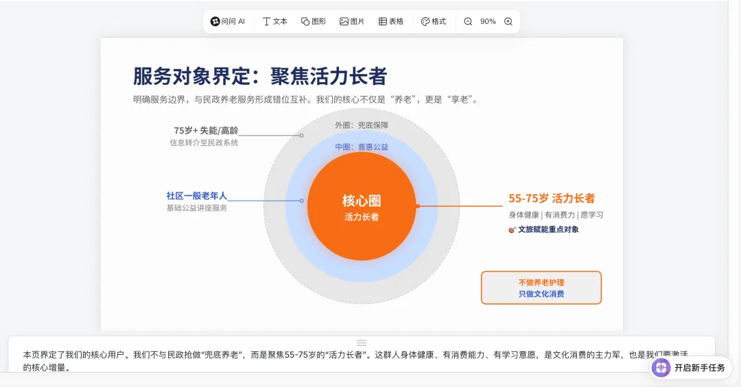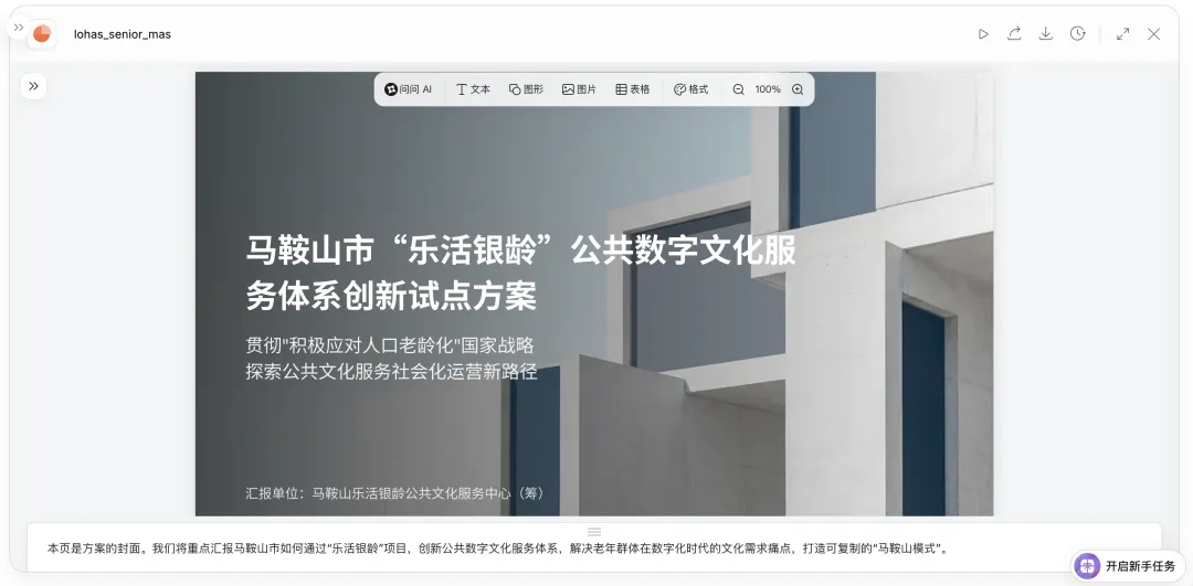 做汇报,肯定需要些可视化图形来提高点逼格。饼图、环形图,这些东西最考验AI能不能理解数据。真的要点个赞。虽然环形图的配色和样式只能说一般,但是它听懂了我要表达什么。数据逻辑是对的,而且底部还贴心地生成了演讲稿内容。这对咱们这种懒人来说,简直是救命稻草。这兄弟真的...它直接把我的大纲文字复制粘贴上去了! 我要的是图啊!我要的是可视化啊! 它完全不理解“数据可视化”这个需求,感觉就是在填空。元素是最全的,逻辑也是最清晰的。但是...这排版错位是什么情况? 我也知道手动调一下就行,但我手残啊!我都用AI了,你还让我手动对齐?04