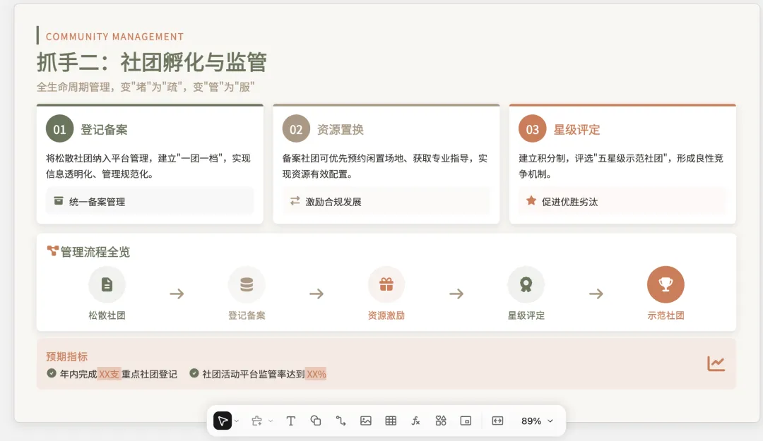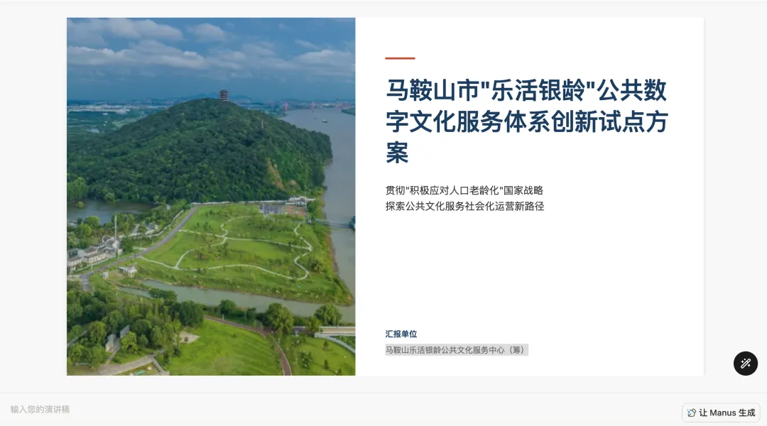 PPT这种东西,封面定生死。尤其是给政府部门汇报,审美得在线。同样的提示词,AnyGen生成了15页,Manus 12页,Kimi 14页。我们只看封面:有一说一,不算惊艳,但中规中矩,商务风拿捏住了,属于刚刚够直接用的水平。这是个啥?大段大段的空白,配色奇怪,审美着实有点...怎么说呢,有点“复古”?这就属于那种会被领导直接丢回来的设计,真的很Low。03