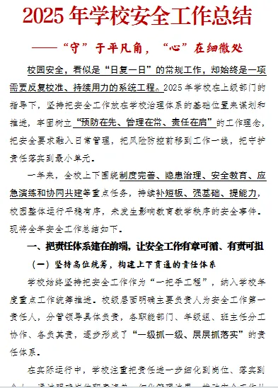2025年秋季学期安全工作总结ppt:“守”于平凡角,“心”在细微处.(含文稿)