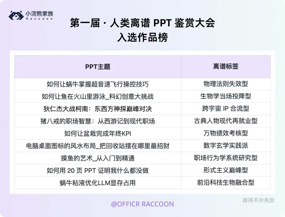 恭喜以上 9 个作品,成功入选「第一届 · 人类离谱 PPT 鉴赏大会」作品榜。