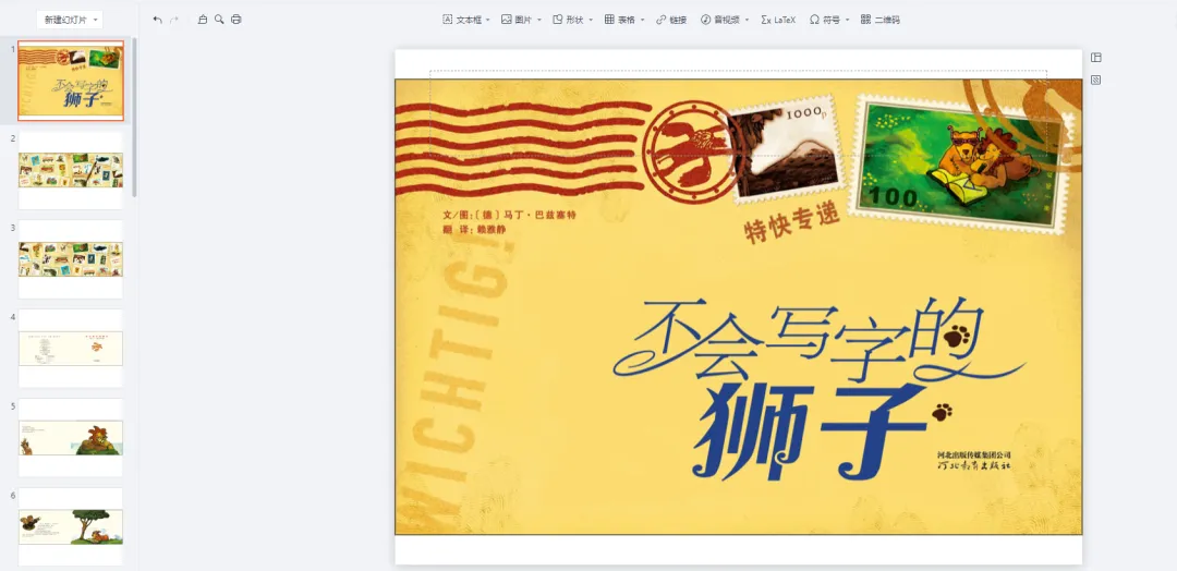 绘本阅读是幼儿教育的重要方式,但许多家长因孩子不识字或价格高而忽视其价值。实际上,绘本通过图文结合能同时刺激儿童的视觉和语言发展。优质绘本能提升儿童的认知、语言和社交能力。长期阅读对学业发展和亲子关系都有积极影响。绘本既是学习工具,也是亲子互动的桥梁。绘本PPT通过丰富多彩的故事和生动的画面,激发幼儿园儿童的学习兴趣,培养他们的阅读能力、想象力和创造力。 绘本PPT电子版画册涵盖了各种主题和风格,包括寓言故事、科普知识、生活常识、人际交往等方面,满足不同年龄段儿童的阅读需求。这些绘本不仅具有丰富的故事情节和精美的插图,还注重文字表达简洁易懂,适合幼儿园儿童阅读和理解。狮子只是想写信告诉母狮子,她有多么美丽,告诉她,多么想见到她,想和她在一起,懒洋洋地躺在树底下——这才是狮子的世界,没有任何动物可以体验、取代。