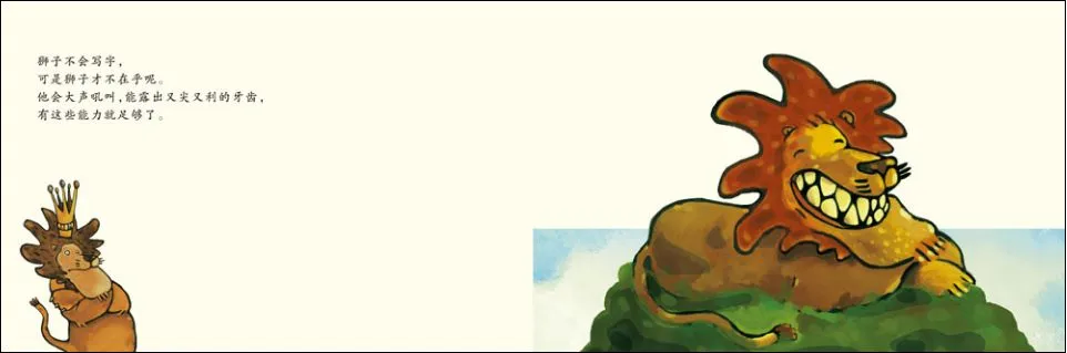 流与爱是自然而然、发自内心的。这样一个看似简单的故事,却也可以从很多角度去解读。有残酷:莽夫般的狮子吃掉了教会他“对待淑女,我们应该先写信给她,才能亲吻她”的牧师;鳄鱼吃掉了长颈鹿,他想给爱人分享的幸福是“还有没吃完的长颈鹿”。也有温情:深浓的绿茵地,母狮子在教狮子写字,从A开始。当然,我们也可以从认字有多重要这个角度去理解,如果不会写字,不学习,甚至想向心仪的对象表达都变成了困难。至于孩子们到底会从哪一个角度理解,又会得到怎样的安慰,就让他们自己去体验吧。狮子不会写字,可是狮子才不在乎呢。他会大声吼叫,能露出又尖又利的牙齿,有这些能力就够了。