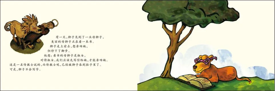 有一天,狮子见到了一头母狮子,美丽的母狮子正在看一本书。狮子走上前去,想亲吻她,但停下了脚步。他想:看书的母狮子是淑女,对待淑女,我们应该先写信给她,才能亲吻她。这是一名传教士说的,而传教士呢,已经被狮子吞到肚子里了。可是狮子不会写字。