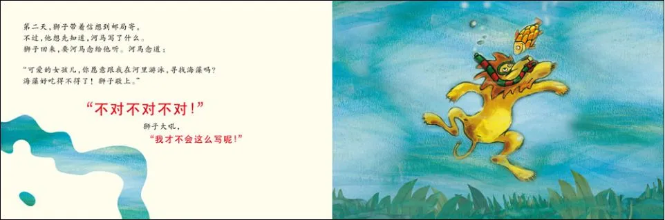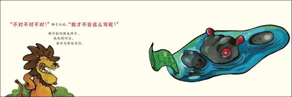 “不对不对不对!”狮子大吼,“我才不会这么写呢!”狮子把信撕成碎片。他来到河边,要河马帮他写信。