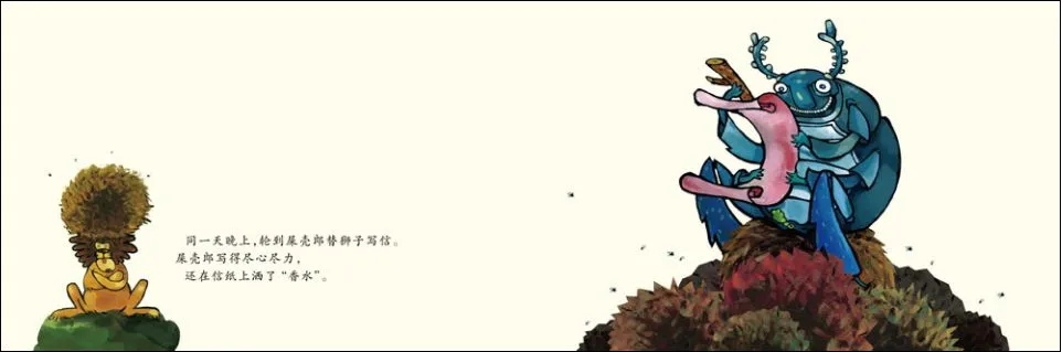 同一天晚上,轮到屎壳郎替狮子写信。屎壳郎写得尽心尽力,还在信纸上洒了“香水”。