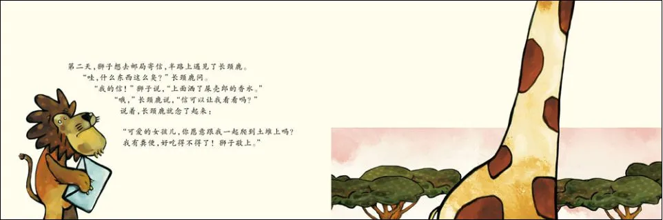 第二天,狮子想去邮局寄信,半路上遇到长颈鹿。“哇,什么东西这么臭?”长颈鹿问。“我的信!”狮子说,“上面洒了屎壳郎的香水。”“哦,”长颈鹿说,“信可以让我看看吗?”说着,长颈鹿就念了起来:“可爱的女孩儿,你愿意和我一起爬到土堆上吗?我有粪便,好吃得不得了!狮子敬上。”