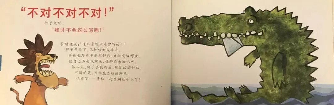 “不对不对不对!”狮子大吼,“我才不会这么写呢!”长颈鹿说:“这本来就不是你写的!”狮子气炸了,他把信撕成碎片。再请长颈鹿重新写好后,直接交给鳄鱼。他自已再去找鳄鱼,让他念给自已听。第二天,狮子去找鳄鱼,想拿回那封信,可惜的是,长颈鹿已被鳄鱼吃掉了——连信一起吞到肚子里了!
