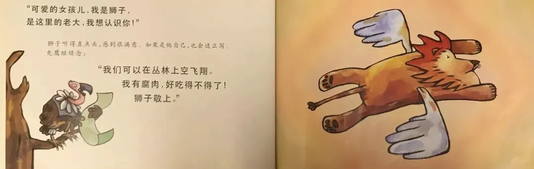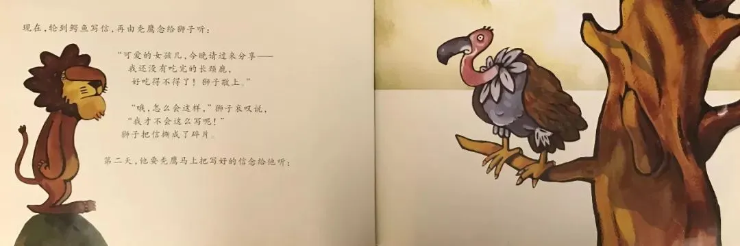 现在,轮到鳄鱼写信,再由秃鹰念给狮子听:“可爱的女孩儿,今晚请过来分享——我还没吃完的长颈鹿,好吃得不得了!狮子敬上。”“哦,怎么会这样,”狮子哀叹说,“我才不会这么写呢!”狮了把信撕成了碎片。第二天,他要秃鹰马上把写好的信念给他听: