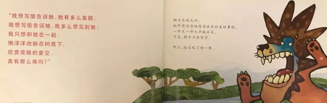 “我想写信告诉她,她有多么美丽;我想写信告诉她,我有多么想见到她;我只想和她在一起,懒洋洋地躺在树底下,欣赏夜晚的星空,真有那么难吗?”狮子大吼大叫,把所有这些他想写出来的一件又一件大声喊出来。可是,狮子不会字书。所以他又吼了好一阵。