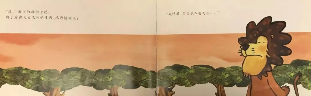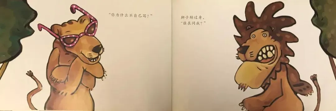 “我。”看书的母狮子说。狮子露出又尖又利的牙齿,难为情地说:“我没写,因为我不会写字......”