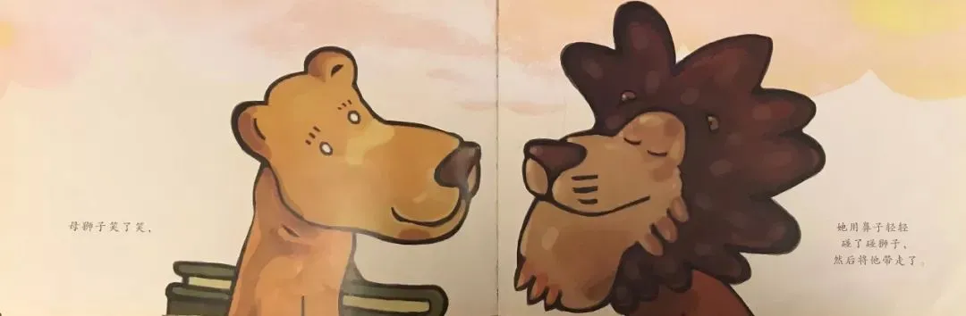 母狮子笑了笑,她用鼻子轻轻碰了碰狮子,然后将他带走了。特别声明:若喜欢此绘本,建议购买正版书籍。文章中的绘本图片均来自网络,版权归原作者或原出版社所有。如有侵权,请及时联系删除。