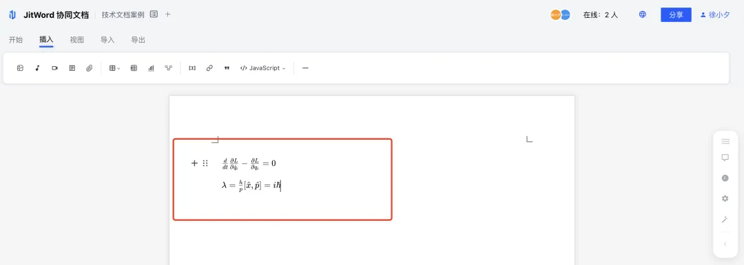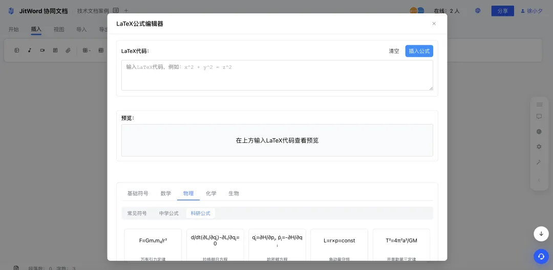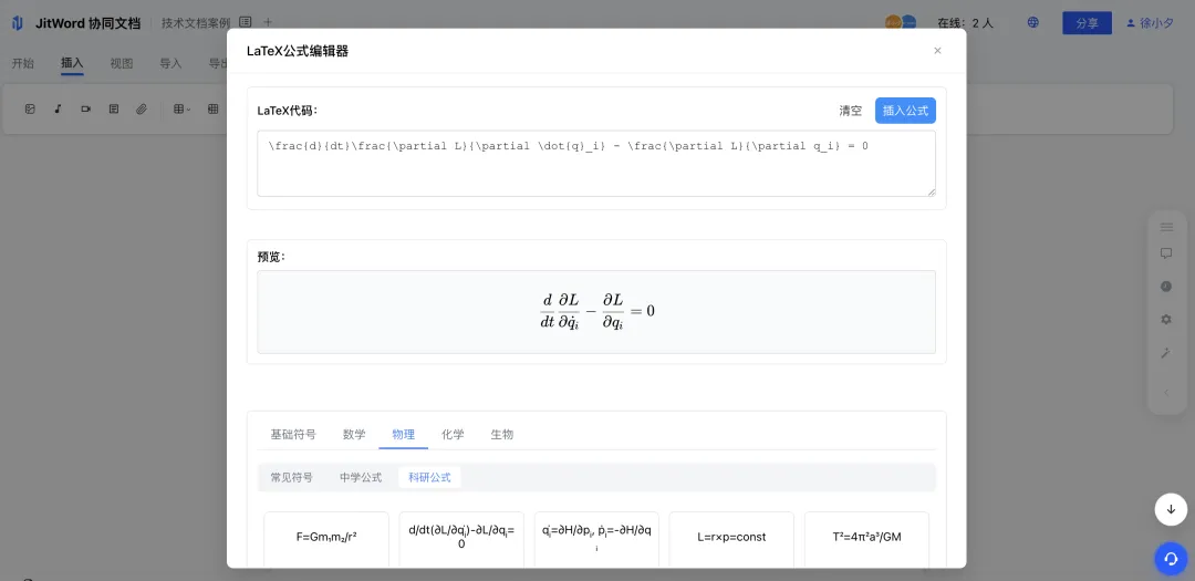 首先,JitWord 提供了一个基于 Web 的协同编辑环境,支持完整的 LaTeX 数学语法,从简单的分数、根号到复杂的矩阵、偏微分方程、张量符号,都能精准渲染。