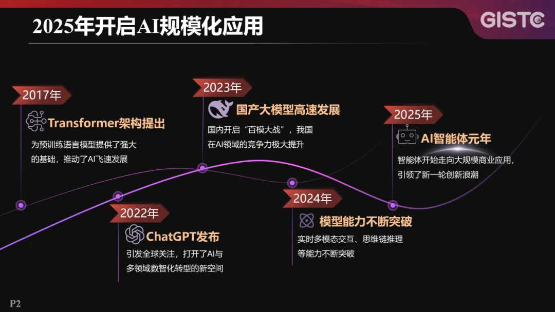 近年来,AI技术发展迅猛。2017年Transformer架构的提出,为预训练语言模型奠定了坚实基础;2022年ChatGPT的发布,为AI发展与多领域数智化转型开辟了新空间;2023年我国国内开启“百模大战”,在AI领域的竞争力大幅提升;2024年模型能力持续突破,实时多模态交互、思维链推理等能力不断增强;2025年被称为AI智能体元年,AI开始走向大规模商业应用。