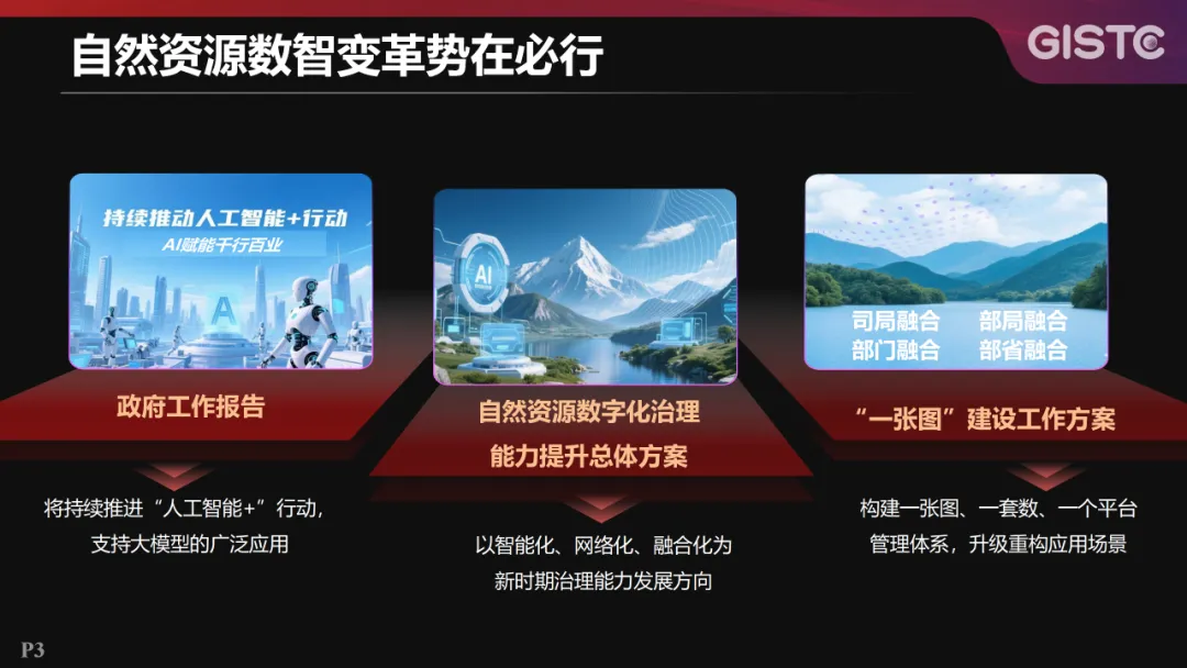 基于此,自然资源数智变革势在必行。今年,政府工作报告提出持续推动“人工智能+”行动;《自然资源数字化治理能力提升总体方案》提出要以智能化、网络化、融合化为新时期治理能力发展方向;《“一张图”建设工作方案》也明确构建“一张图、一套数、一个平台”的具体目标。