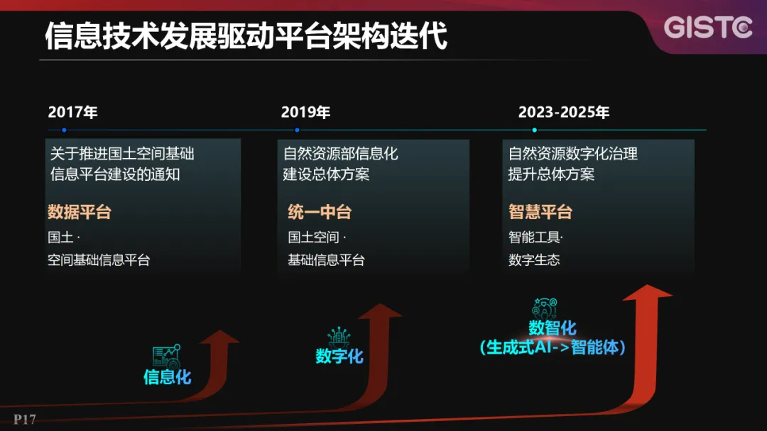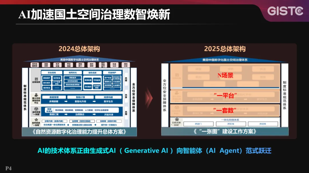 从2025年自然资源数字化治理总体架构来看,业务层面更加聚焦“一套数”“一平台”和应用场景建设;技术层面,AI技术体系正由生成式AI向智能体范式跃迁,这一变化将会对自然资源数字化治理能力提升产生深远影响。