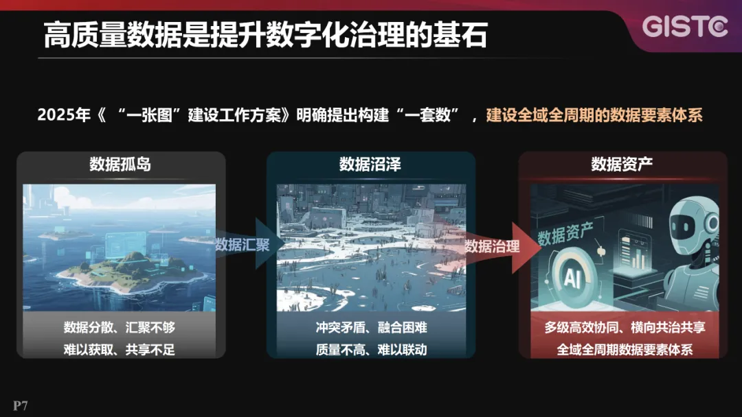 高质量数据是提升数字化治理的基石,2025年,自然资源部《“一张图”建设工作方案》明确提出构建“一套数”,建设全域全周期的数据要素体系。在数据层面,各行业曾面临数据孤岛问题,系统打通后又出现业务之间、部门之间、层级之间的数据冲突和矛盾,即“数据沼泽”。那么,数据治理便是实现数据资产化、多级高效协同及横向共治共享的有效途径。