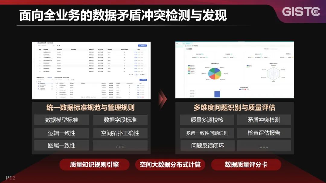 特性二:面向全业务的数据矛盾冲突检测与发现。产品引入质量知识规则引擎、空间大数据分布式计算、数据质量评分卡等,构建起统一的数据标准规范与管理规则,提供质量多源校核、矛盾冲突检测、多跨一致性问题识别等功能,实现多维度问题识别与质量评估。
