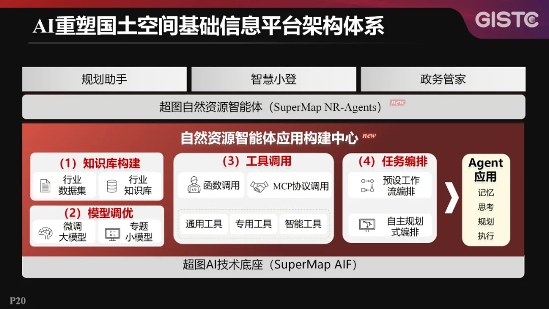 由于智能体的引入,国土空间基础信息平台架构体系需升级,增设了自然资源智能体应用构建中心。该中心提供知识库构建、模型调优、工具调用和任务编排等能力,支持快速构建规划助手、智慧小登、政务管家等自然资源智能体应用。