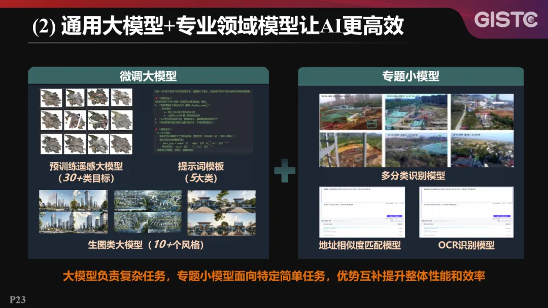 在微调大模型方面,预训练了支持30多类目标识别的遥感大模型、5大类提示词模板、10多个风格的生图类大模型;在专题小模型方面,提供了多分类识别模型、地址相似度匹配模型和OCR识别模型等。大模型负责复杂任务,专题小模型面向特定简单任务,通过大小模型的优势互补,提升整体性能和效率。